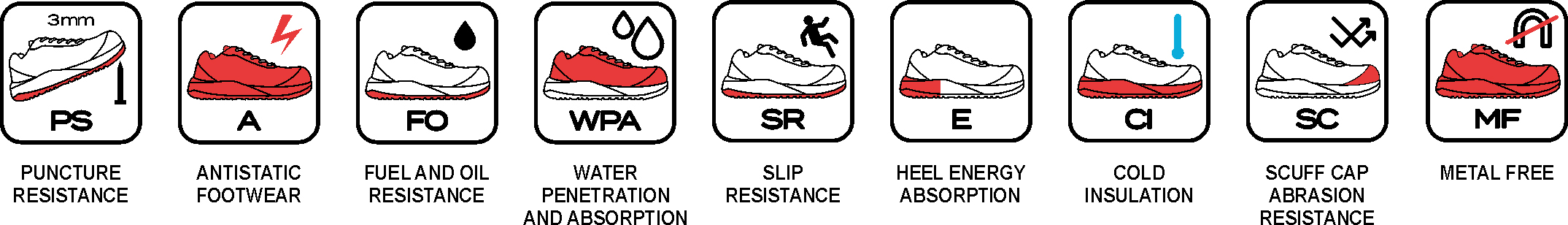 Διαθέτουν προστατευτικό κάλυμμα δακτύλων από fiberglass αντοχής 200 joules και αντιδιατρητική σόλα από υφαντές ίνες, προσφέροντας ολοκληρωμένη προστασία. Η σόλα πολυουρεθάνης διπλής πυκνότητας εξασφαλίζει εξαιρετική πρόσφυση και απορρόφηση κραδασμών, ενώ η ενίσχυση σε δάχτυλα και πτέρνα αυξάνει την ανθεκτικότητα σε έντονη χρήση.