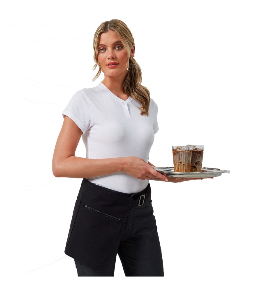 Κοντή ποδιά μέσης  με στογγυλεμένες γωνίες από 100% βαμβάκι. Τσέπη για το τάμπλετ, τσέπη με φερμουαρ. Κλείσιμο με μεταλλικό γαντζάκι γύρω απο τη μέση και λουρί σύσφιξης με αγκράφα . Διατίθεται σε μαύρο και μπεζ χρώμα. Για τέλεια εφαρμογή και ποιότητα που διαρκεί ακολουθήστε τις οδηγίες πλυσίματος που αναγράφονται στην ειδική ετικέτα. Επικοινωνήστε τηλεφωνικά για περισσότερες πληροφορίες ή/και για παραγγελίες.