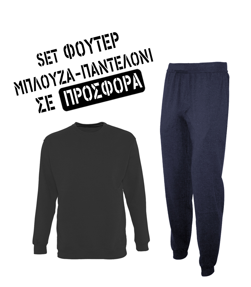 Φόρμα Φούτερ Γκρί-Μπλε από 80% βαμβ. - 20% polyester διατίθεται σε διάφορους χρωματικούς συνδυασμούς . Η μπλούζα διαθέτει, ελαστικό ριπ στις μανσέτες και στο τελείωμα. Το παντελόνι έχει λάστιχο στη μέση με κορδόνι. 2πλαϊνές τσέπες,λάστιχο στο τελείωμα-γκέτα. Για τέλεια εφαρμογή και ποιότητα που διαρκεί ακολουθήστε τις οδηγίες πλυσίματος που αναγράφονται στην ειδική ετικέτα. Επικοινωνήστε τηλεφωνικά για περισσότερες πληροφορίες ή/και για παραγγελίες.