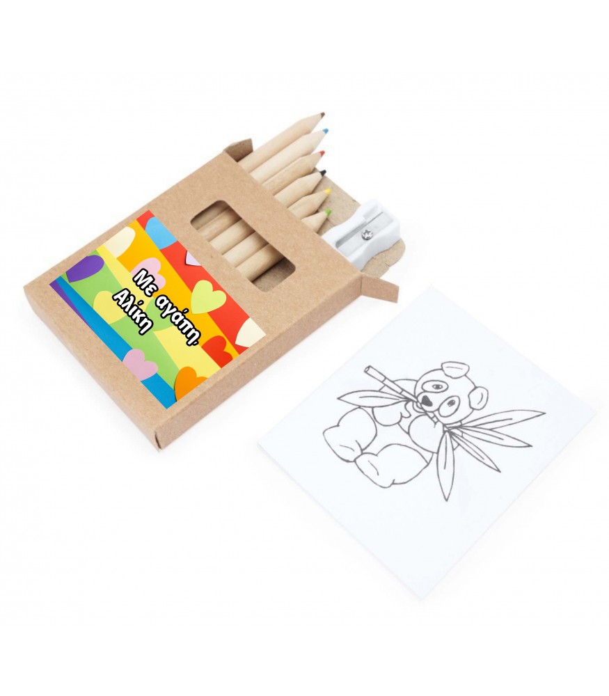 Σετ ζωγραφικής για παιδιά, ιδανικό για δημιουργικές στιγμές στο σπίτι, στο σχολείο ή σε παιδικά πάρτι. Περιλαμβάνει 20 φύλλα με σχέδια, 6 χρωματιστά μολύβια και ξύστρα, όλα συσκευασμένα σε οικολογική συσκευασία.